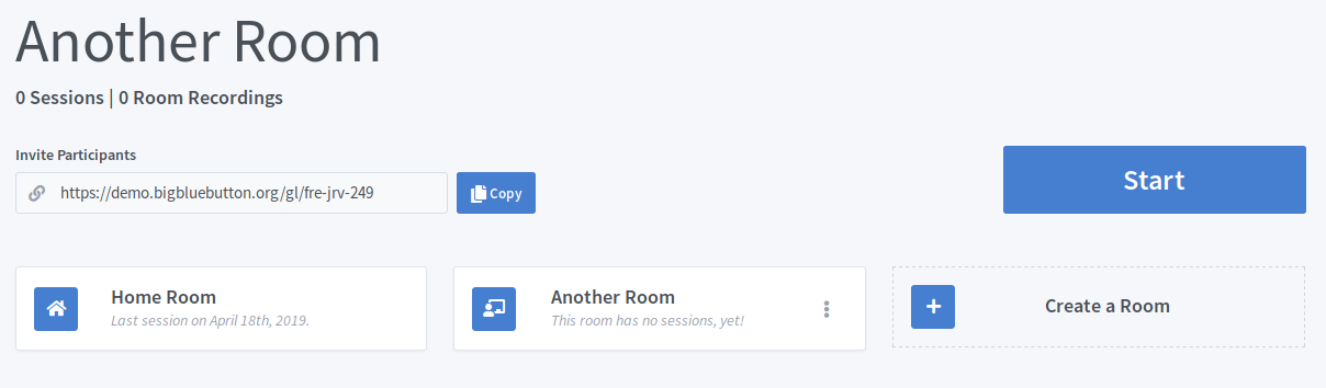 Greenlight est construit autour du concept de salon. Un salon est une salle appartenant à un utilisateur. Il peut ajuster les paramètres des salons, démarrer / arrêter un salon, inviter d'autres personnes dans son salon à l'aide d'une URL courte facilement communicable, suivre les sessions, etc.