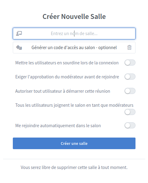 | Générer un code d'accès au salon | Génère un code d'accès que les utilisateurs doivent saisir avant d'être autorisés à rejoindre la salle. Un code d'accès peut être généré de manière aléatoire en cliquant sur l'icône en forme de dés à gauche et peut être supprimé en cliquant sur la poubelle à droite. |